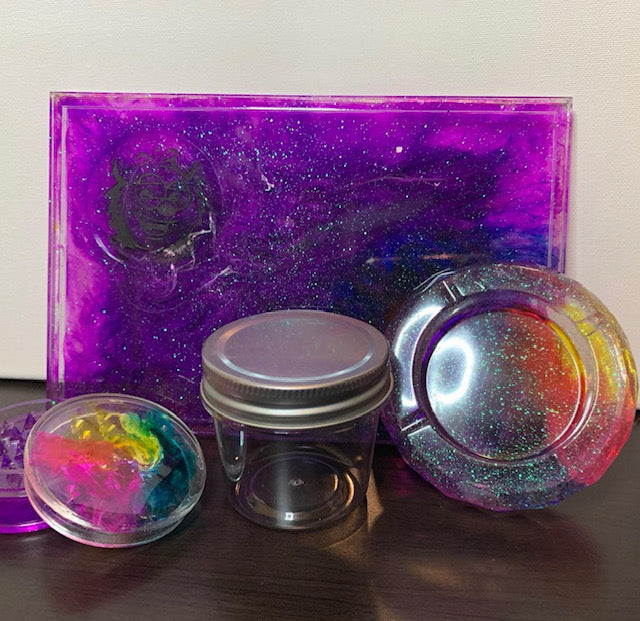 Elevate your smoking experience with the Zaza & Runtz Fullset. Made from high-quality resin and handmade with care, this full set includes all the essentials: a rolling tray, ashtray, grinder, and stash jar. Featuring a unique galaxy design and vibrant logo colors, this full set is perfect for on-the-go use. No two sets are exactly alike, making each one truly one-of-a-kind. Upgrade your smoking game today.